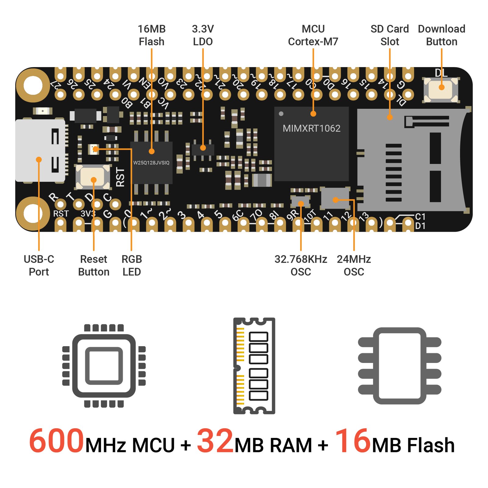 SwiftIO Micro features a 600-MHz MCU with 32 MB of RAM and 16 MB of Flash, providing ample space for running code and storing data.