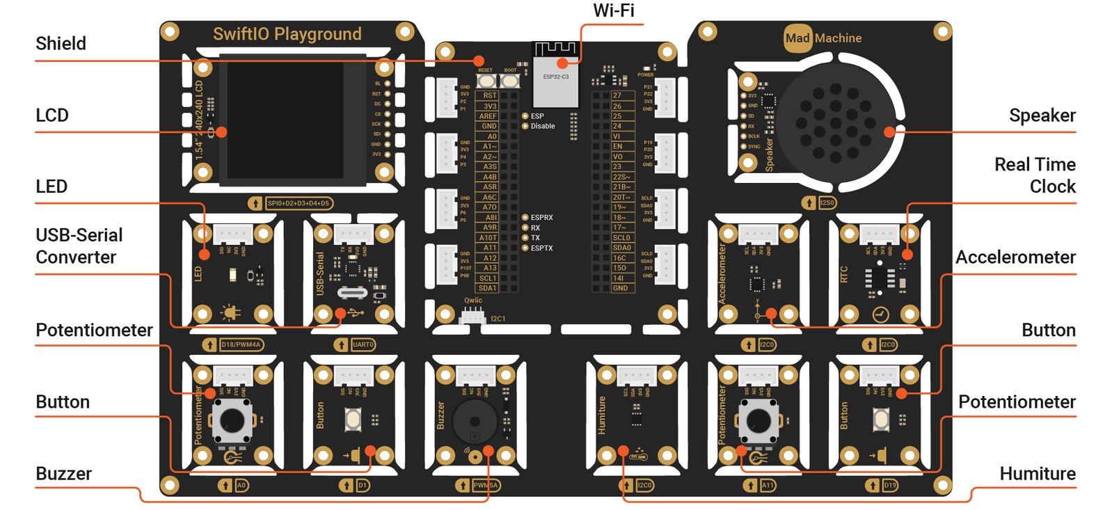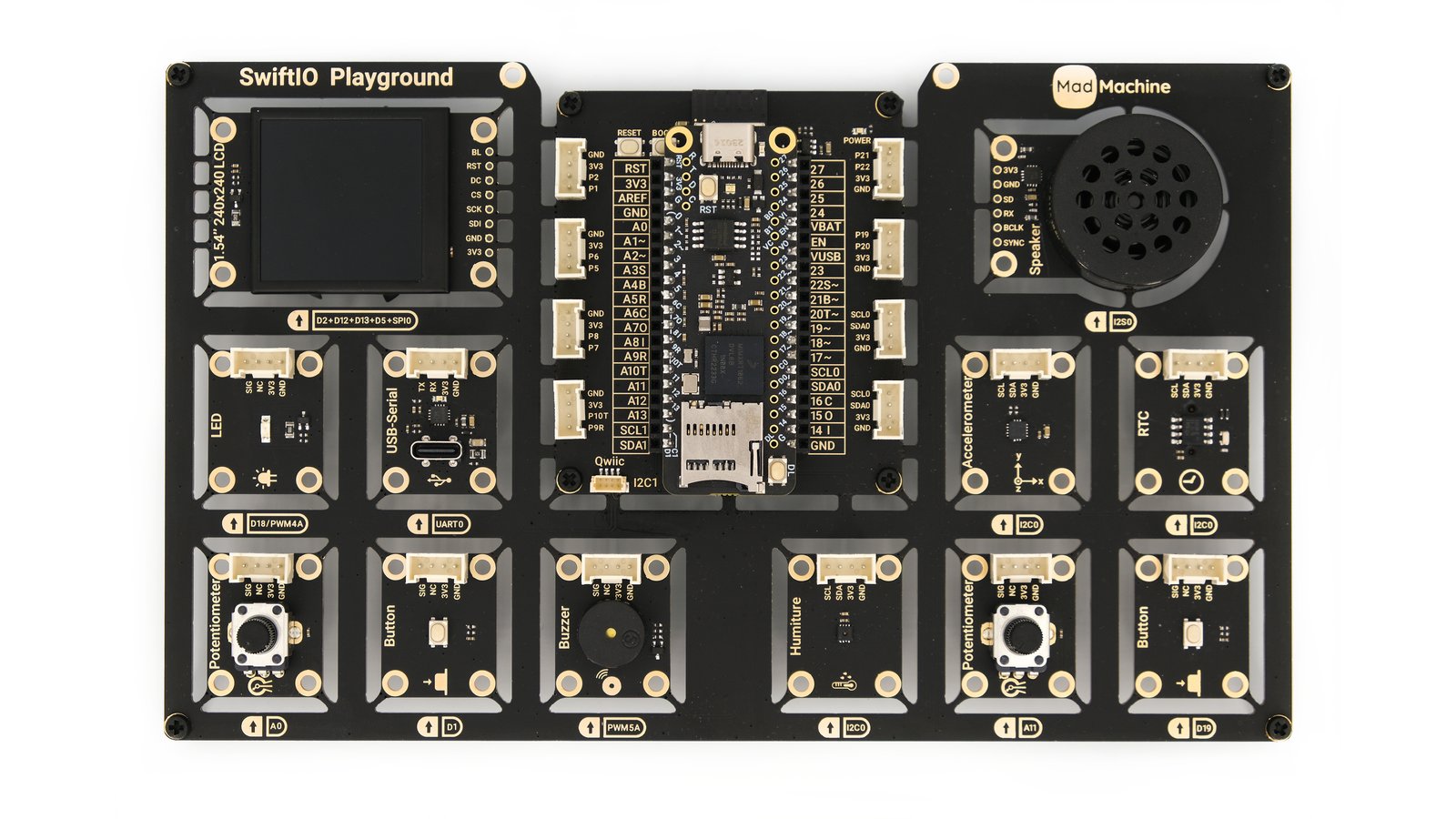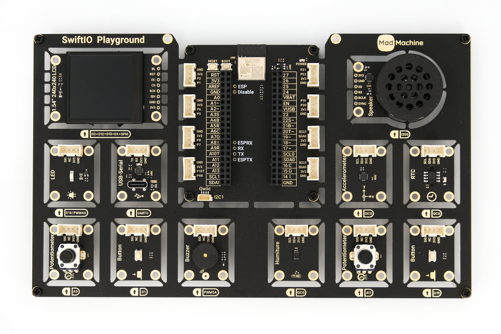 SwiftIO Playground includes 13 diverse modules and an ESP32 module for future Wi-Fi connectivity, expanding your options for exploration and experimentation.