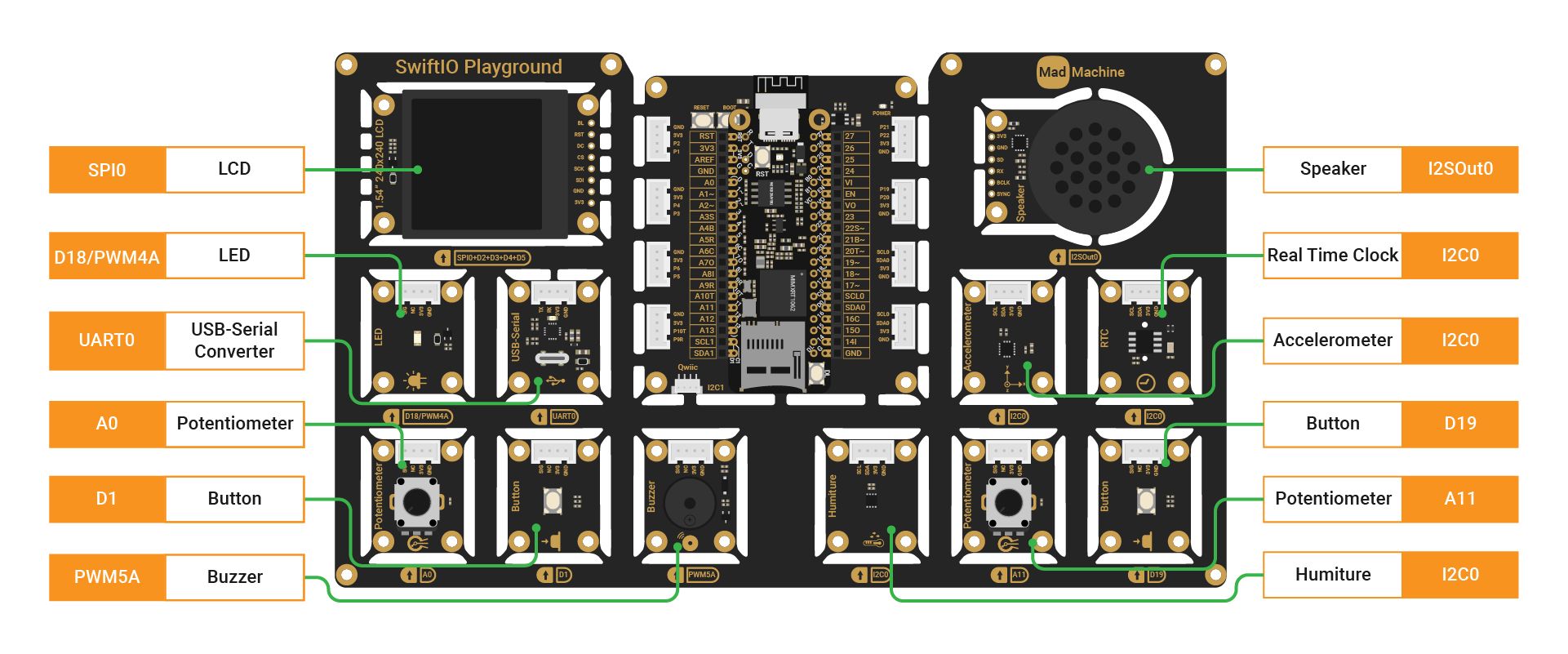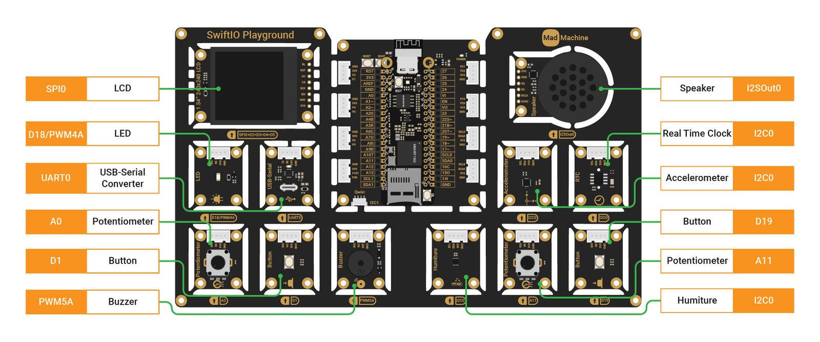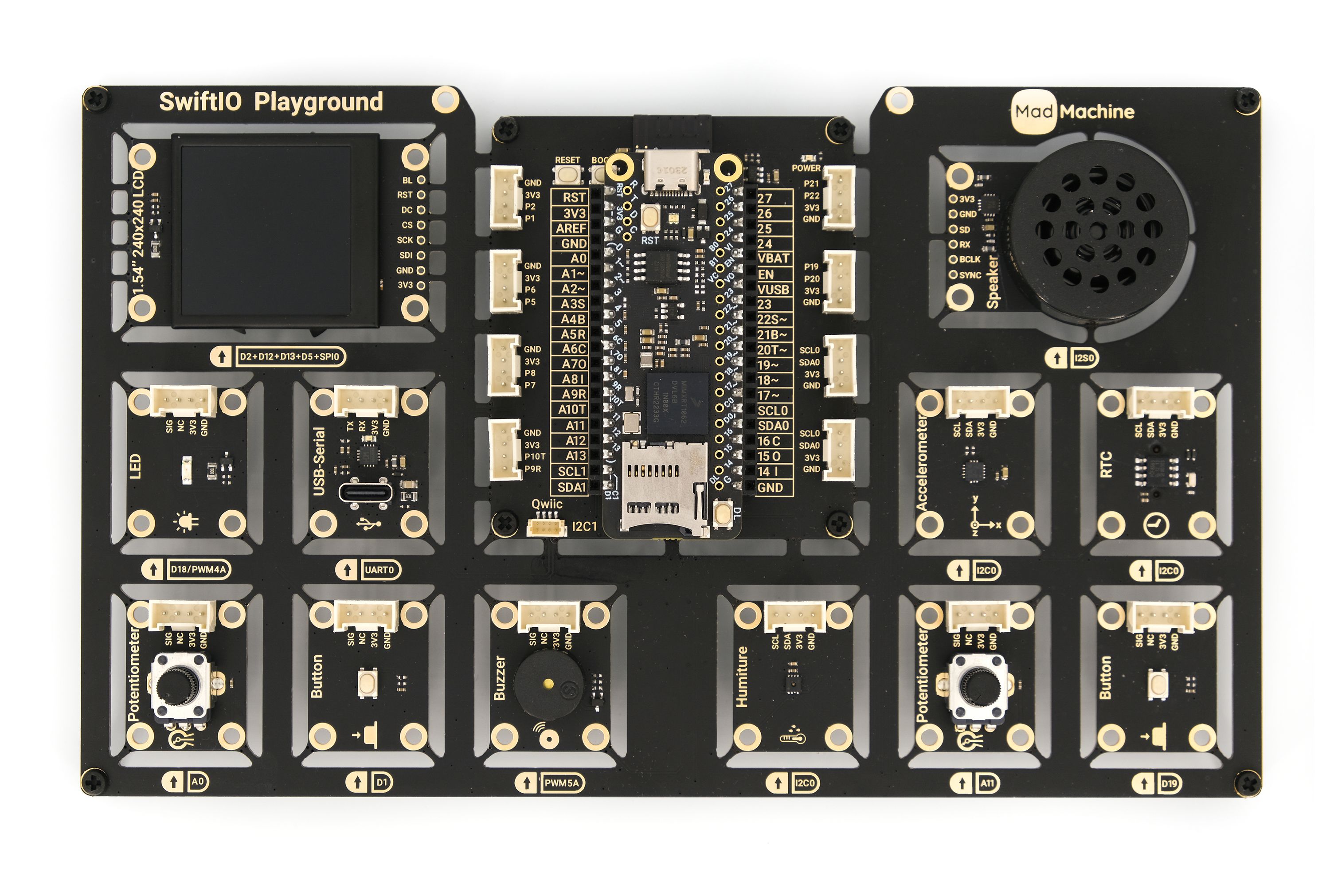 SwiftIO Playground includes 13 diverse modules and an ESP32 module for future Wi-Fi connectivity, expanding your options for exploration and experimentation.