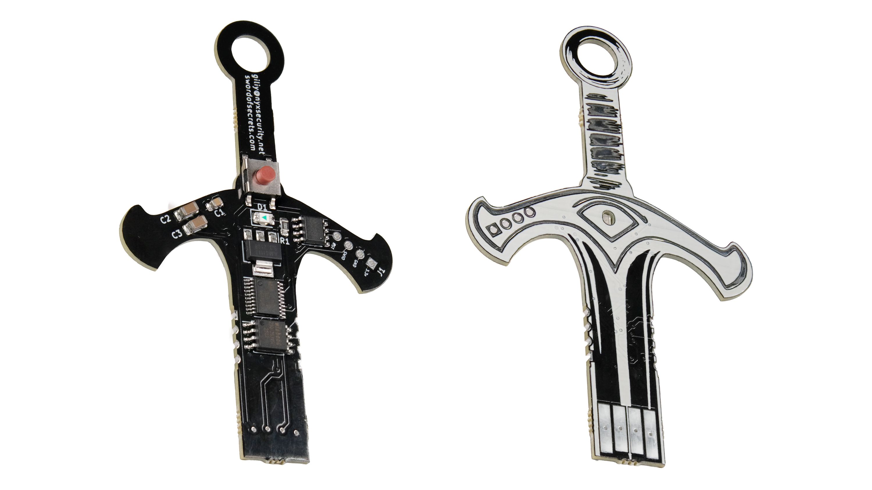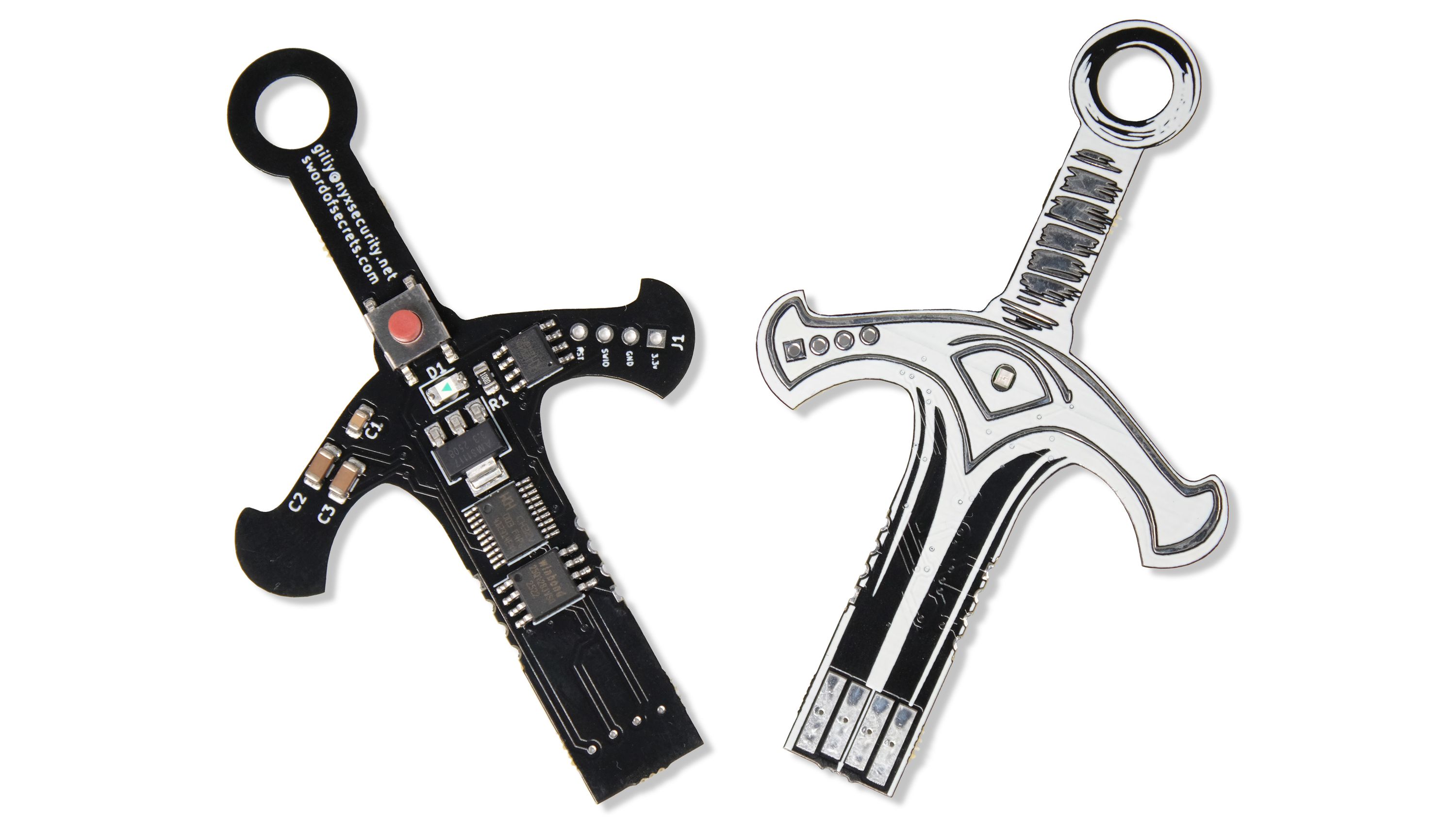 Sword of Secrets is a multi-stage hardware Capture the Flag (CtF) challenge designed for hackers, tinkerers, and puzzle lovers who crave hands-on problem-solving. Housed in a sleek, keychain-sized board, this open-source adventure weaves together hardware hacking, cryptographic trickery, and low-level exploitation. As you delve through the stages, your mastery of embedded systems, RISC-V assembly code, datasheets, and creative debugging will be tested. Solving it means digging into both the schematics and the source code—and truly understanding them.