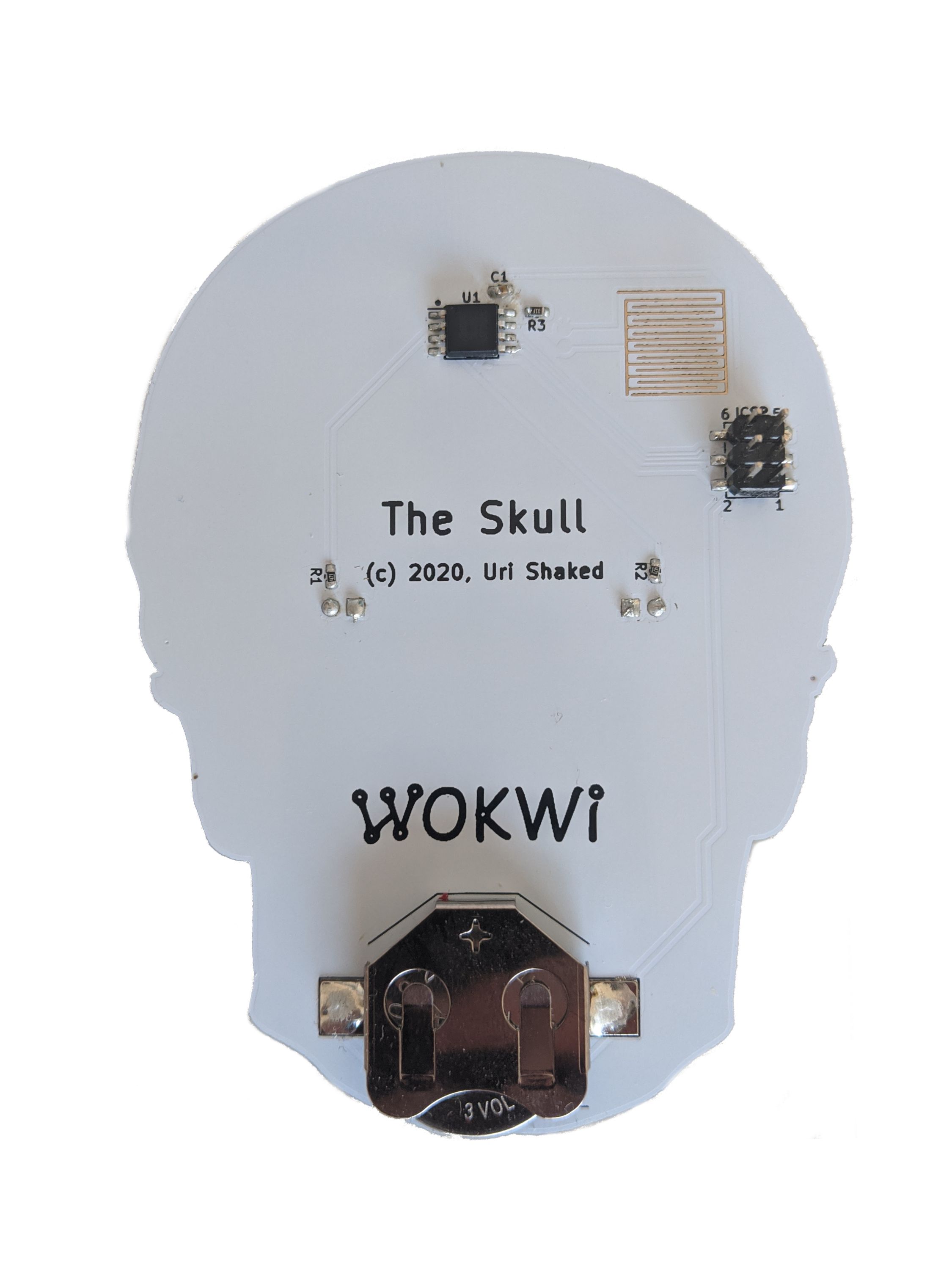 You will not need any special hardware, an electrical connection to the Skull, a soldering iron, a trephine, or necromancy. Nor will you need a battery, because we’ll send you one. A tiny CR2032 coin cell has enough juice to keep the blinkenlights on for at least a year. And we mean at least a year. The wildly efficient ATtiny draws as little as 0.33 µA while in sleep mode, so that battery could theoretically last for 50 years.