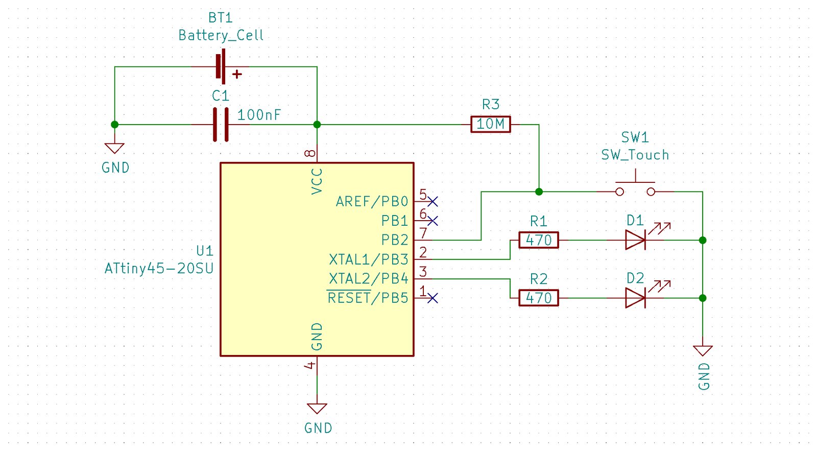 The Skull’s programming pads expose three GPIO pins—PB0, PB1, and PB2—as well as 3V (from the battery) and GND. PB0 and PB1 are currently unused by the firmware, and PB2 is used for the small touch panel on the back.
