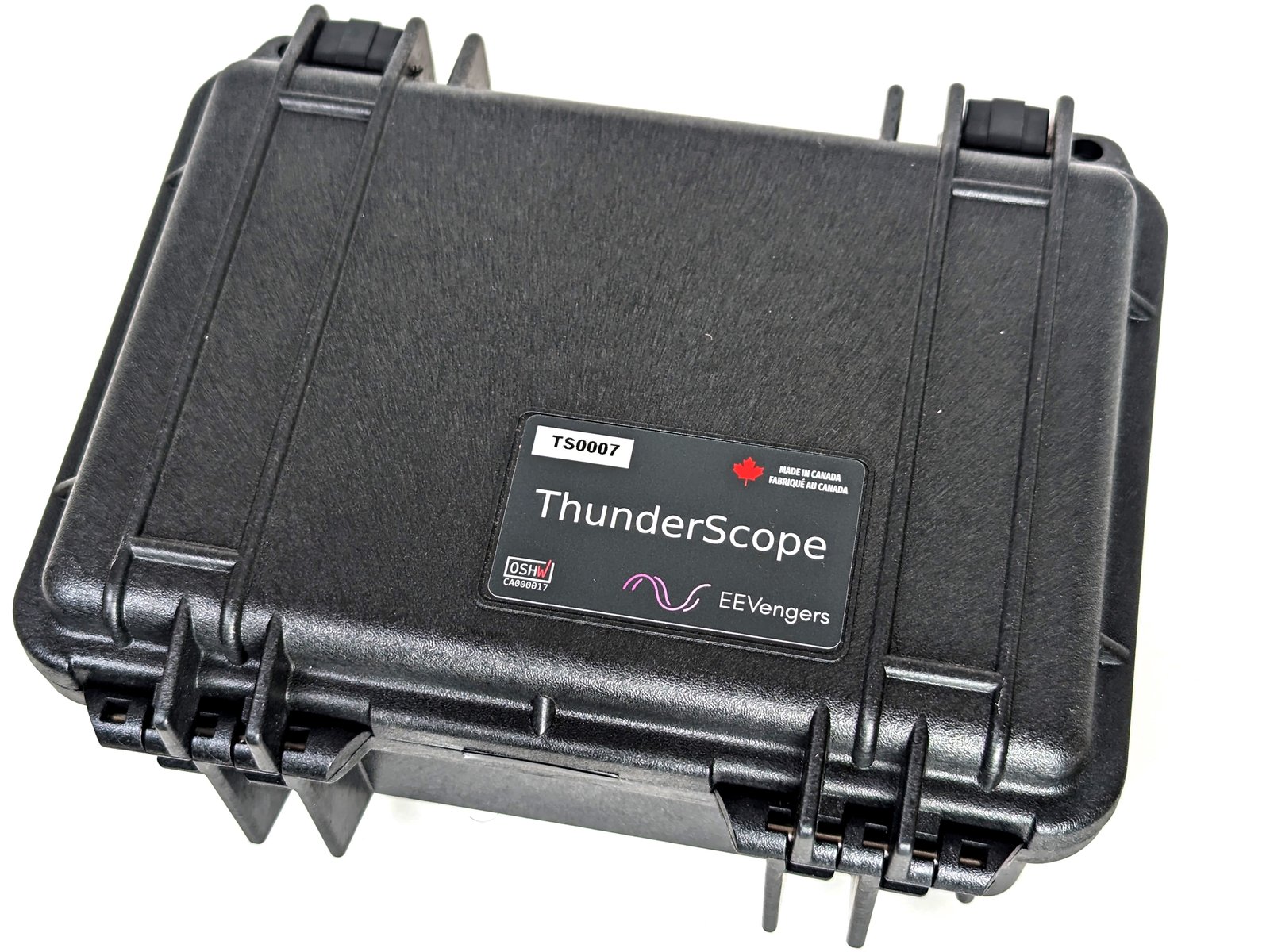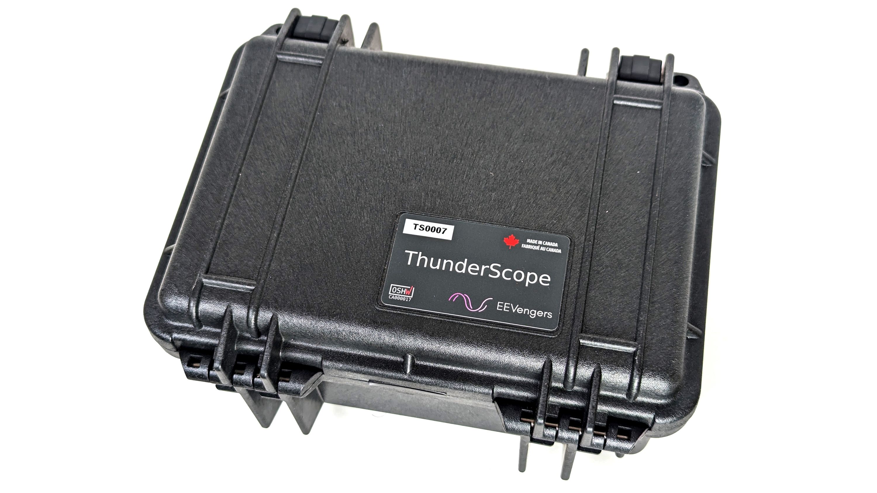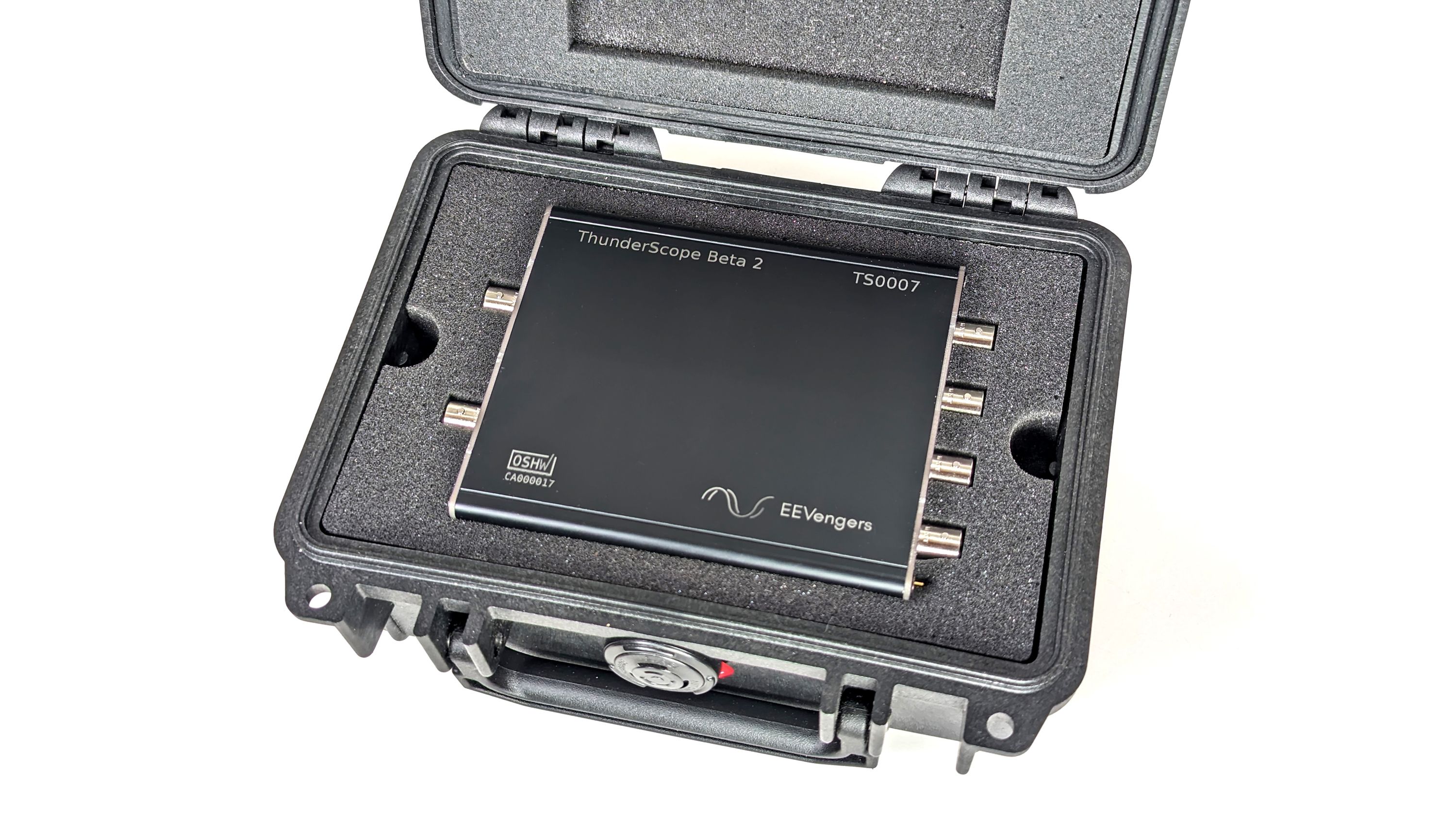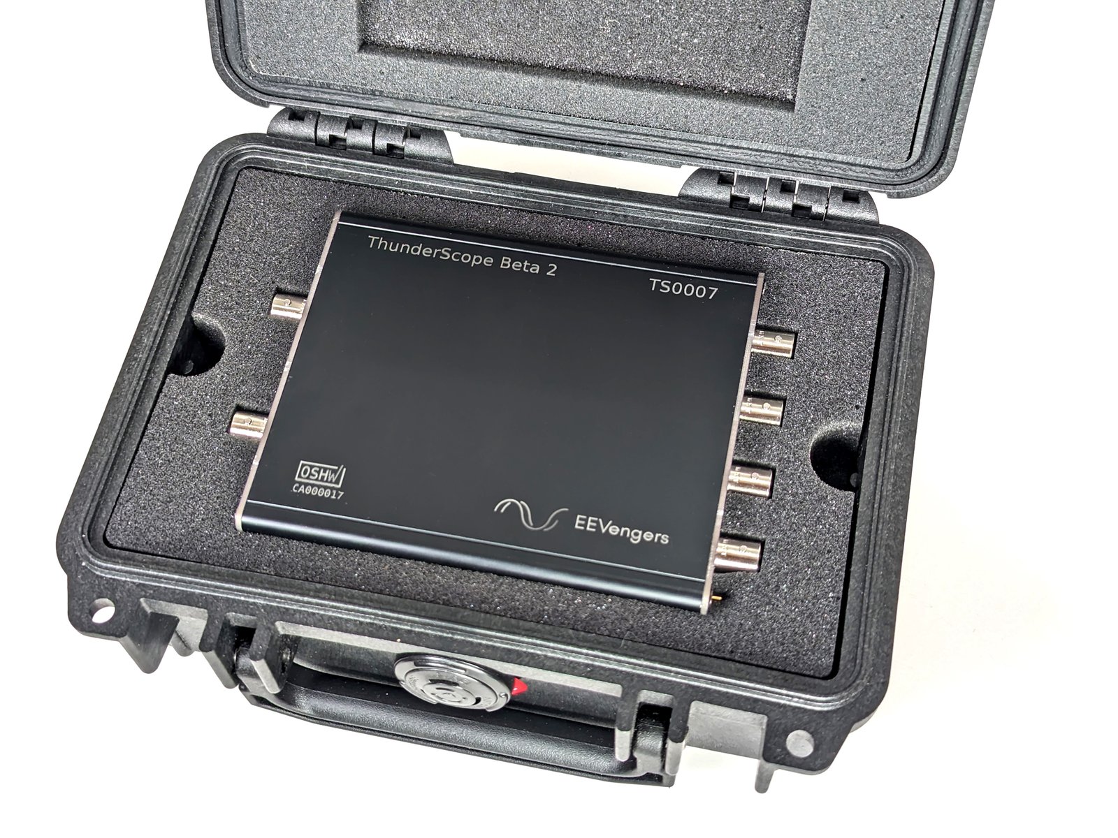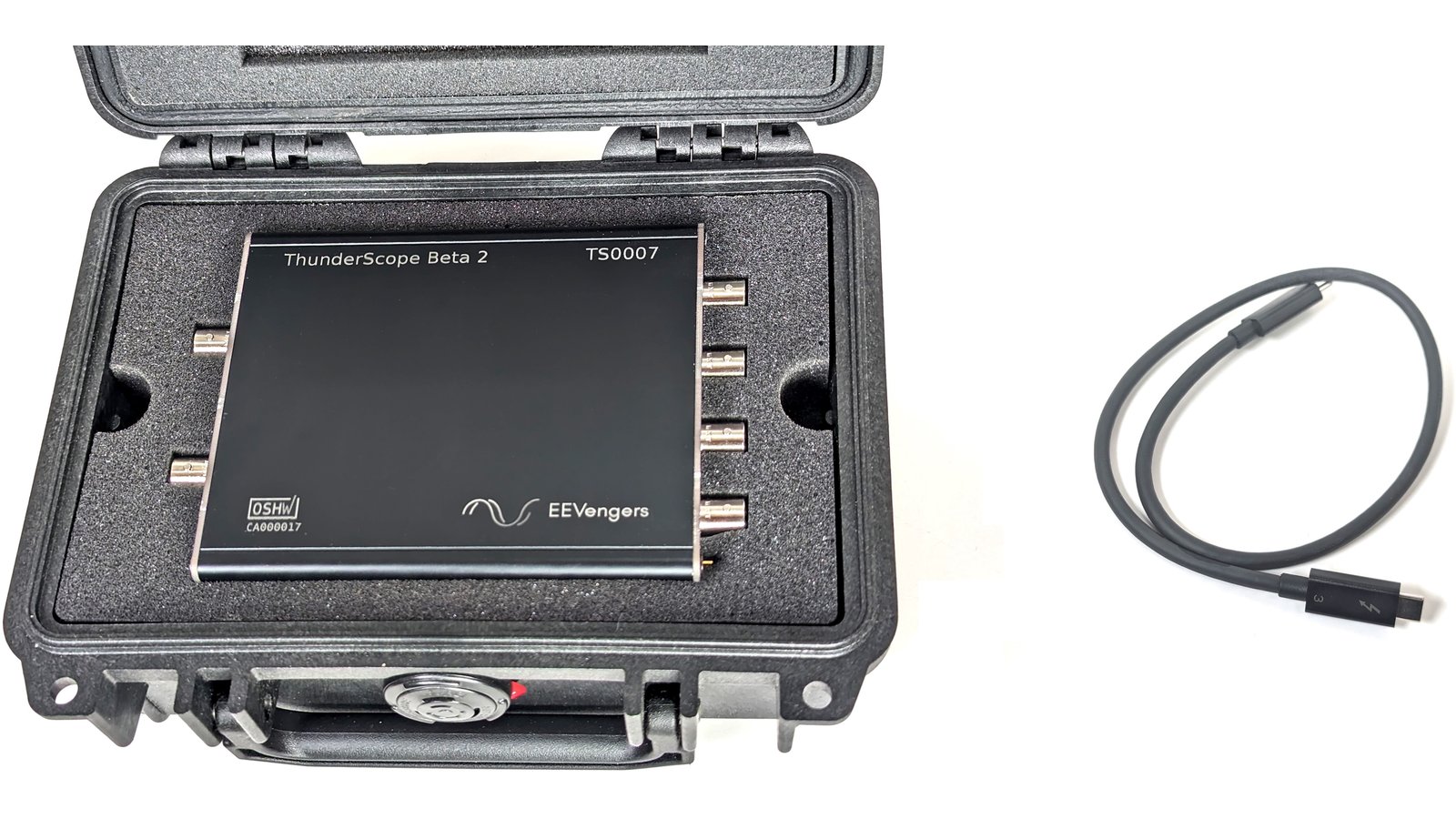 A calibrated ThunderScope in an aluminum enclosure. Comes with a custom Pelican case and 40 Gbps rated USB-C Cable.