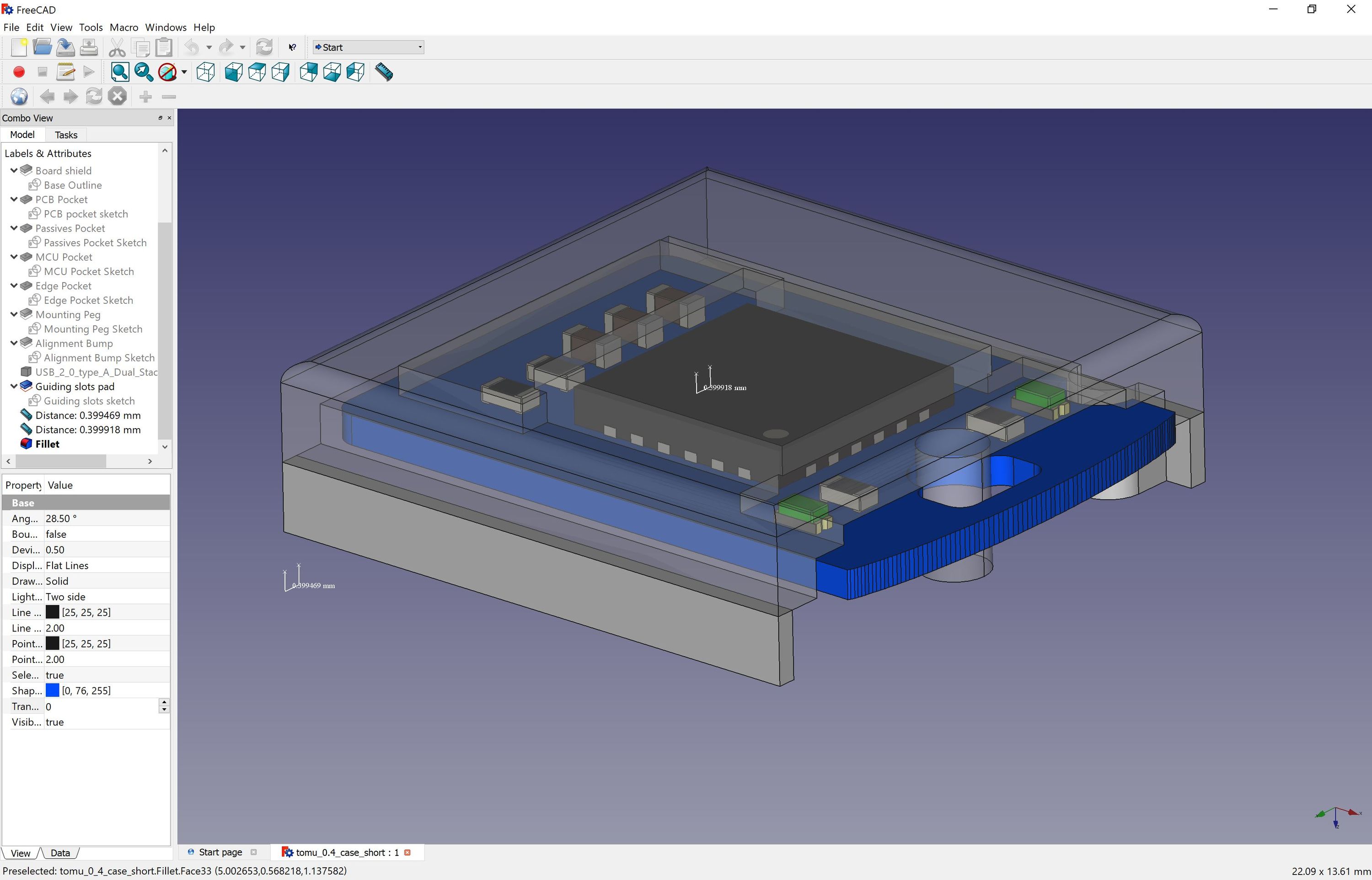 The printed circuit board itself is two layers, which is relatively simple to manufacture. However, things get a little bit tricky because it needs to fit in a USB slot. Most standard PCBs are 1.6 mm thick. The main CPU on Tomu is an additional 0.8 mm thick, which means the overall thickness is at least 2.4 mm. The maximum size of a USB connector is 2.5 mm, but that includes retention pins. Plus, we don’t want the metal housing to short against the PCB. The solution is to make the PCB thinner and use a molded case.