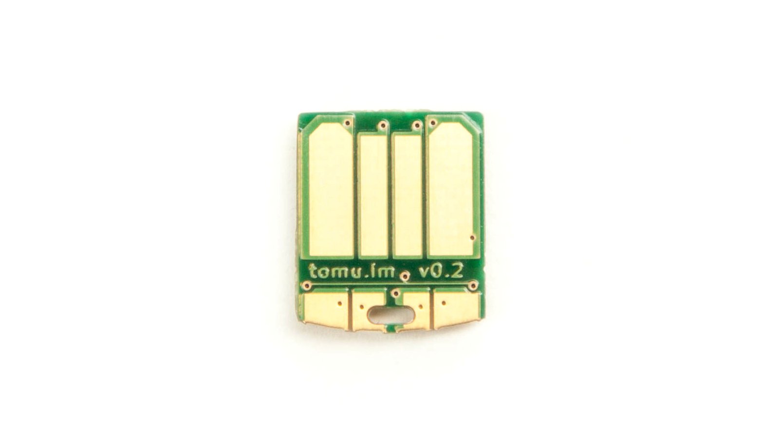 Tomu fits entirely enside your USB port. Most USB products either use a USB connector from a manufacturer, or make the PCB thick enough that they don’t need a connector. Tomu can’t take either of these approaches, because the components must all go on the side of the circuit board opposite the USB contacts, and things like chips and capacitors and resistors tend to be different heights.