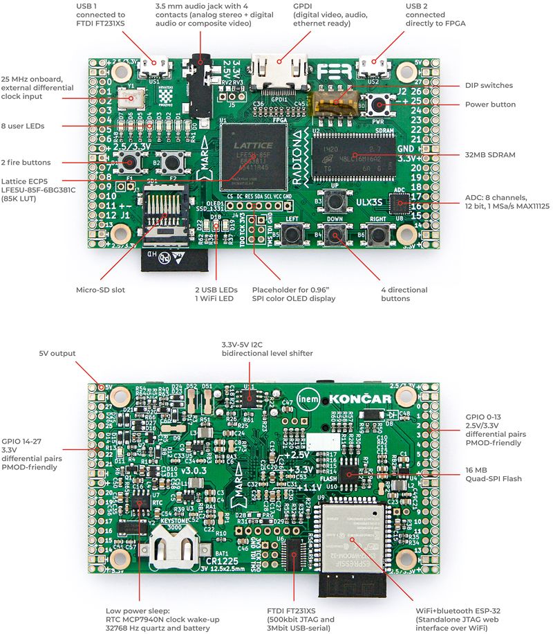 ULX3S has been actively developed since 2016 and is the result of a collaboration between Radiona.org / Zagreb Makerspace and FER – the Faculty of Electrical Engineering and Computing – at the University of Zagreb in Croatia.