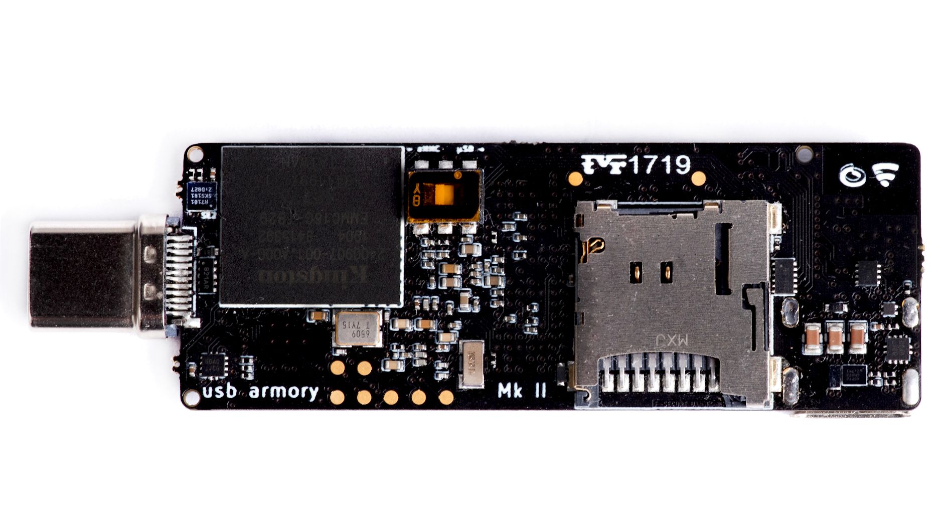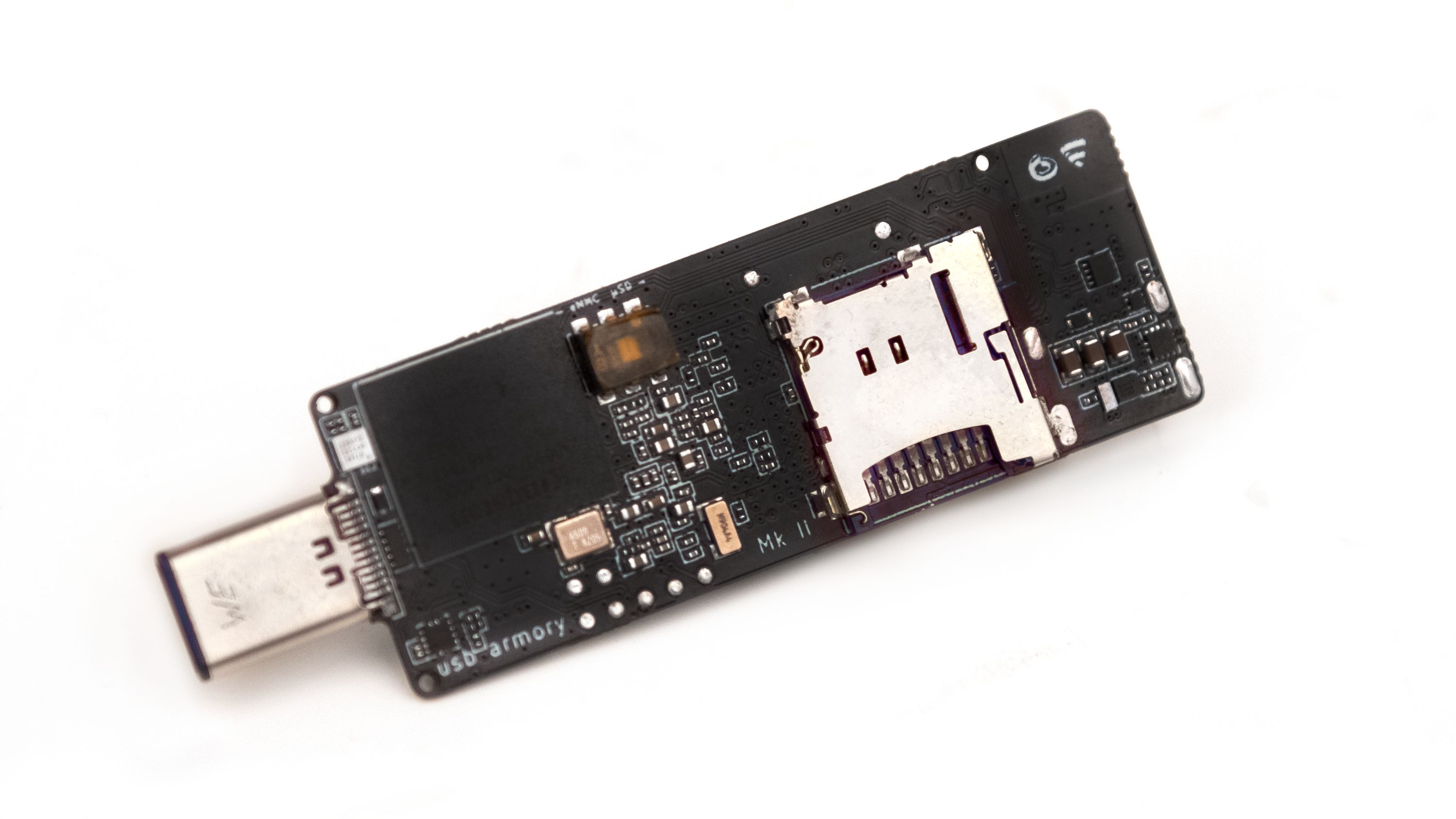 Apart from the traditional microSD slot (now with a spring-loaded push-to-insert, push-to-eject mechanism), the USB armory Mk II includes a 16 GB eMMC flash memory chip on the board.