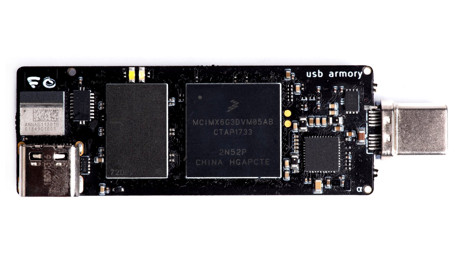 USB armory Mk II features two USB-C ports. Using USB-C allows us to have a plug for traditional USB-based host communication, along with an integrated receptacle to act as a host (or device).