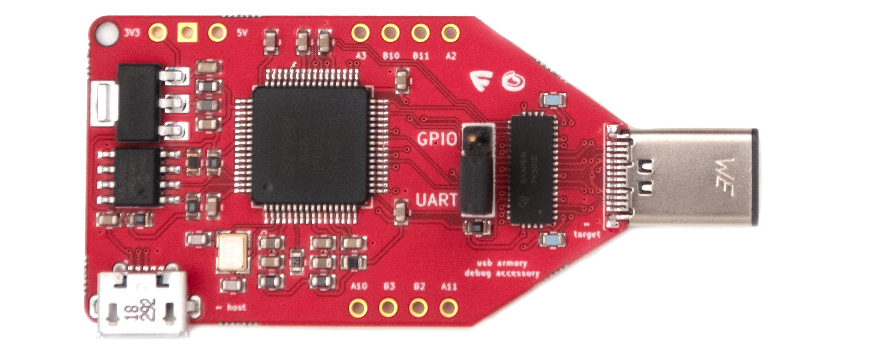 The USB armory Mk II exposes a USB-C receptacle, which allows the so-called ‘debug accessory mode’ to route analog/debug signals over its connector. The USB armory Mk II design leverages this to break out UART, SPI, I²C, and GPIO connections to/from its application processor.