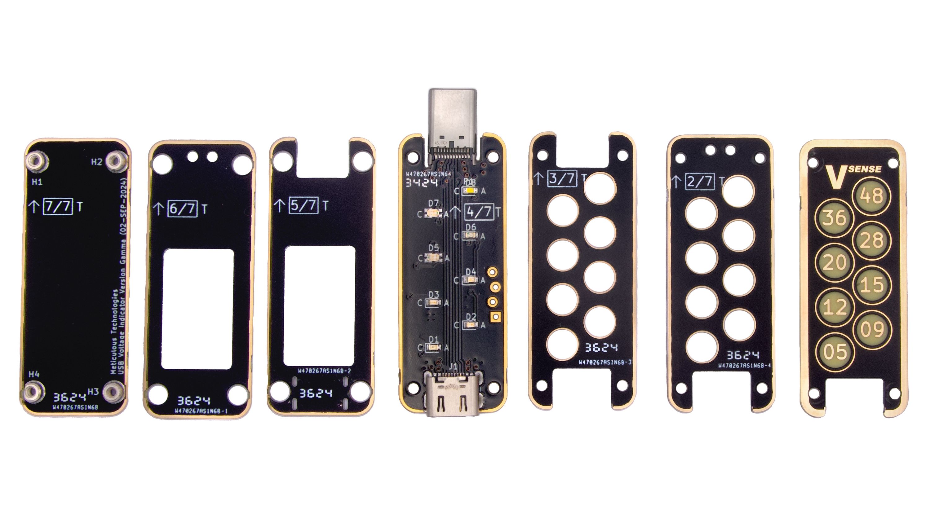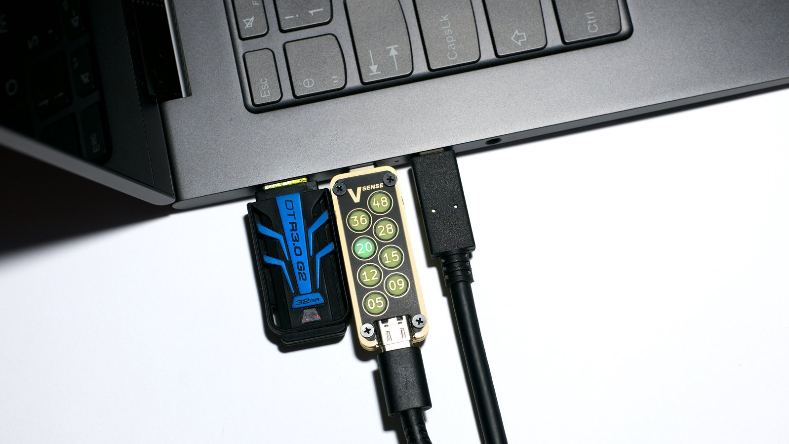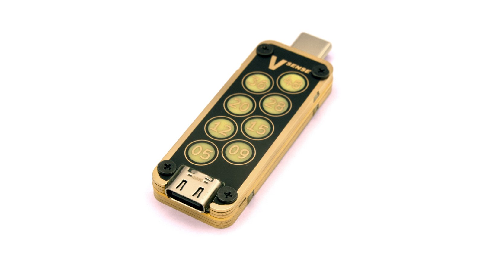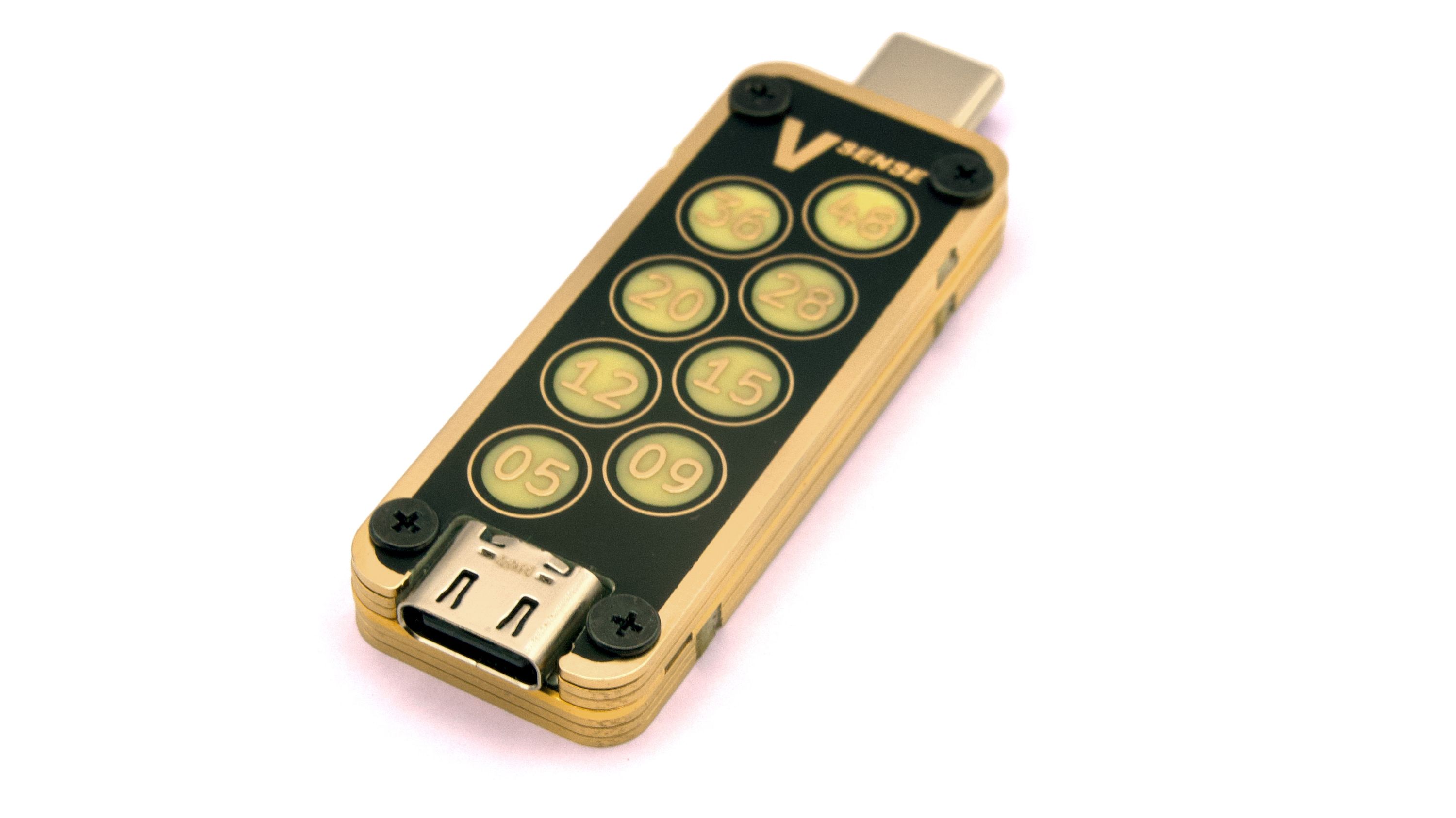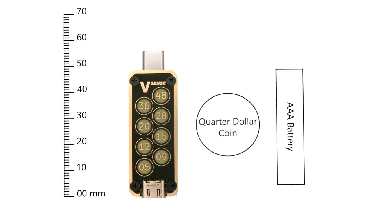 USB VSense is a voltage indicator designed to provide insight into USB-powered devices quickly and simply. USB VSense works by giving you an unambiguous visual indication of the USB voltage mode with the help of illuminated, individually color-coded, and clearly labeled lights, one for each USB Power Delivery fixed voltage mode, up to and including the latest 48 V and 5 A Extended Power Range (EPR) specs.