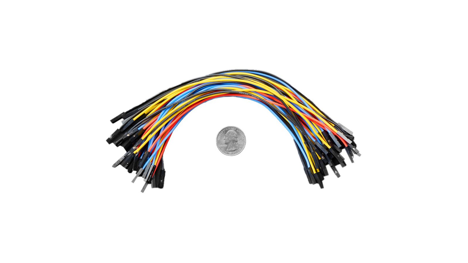 A bundle of 40 multicolored, 7.8" (200 mm) long silicone-coated 24 AWG jumper wires with female terminations on each end. They are designed for use with standard pitch (.1", 2.54 mm) male headers.