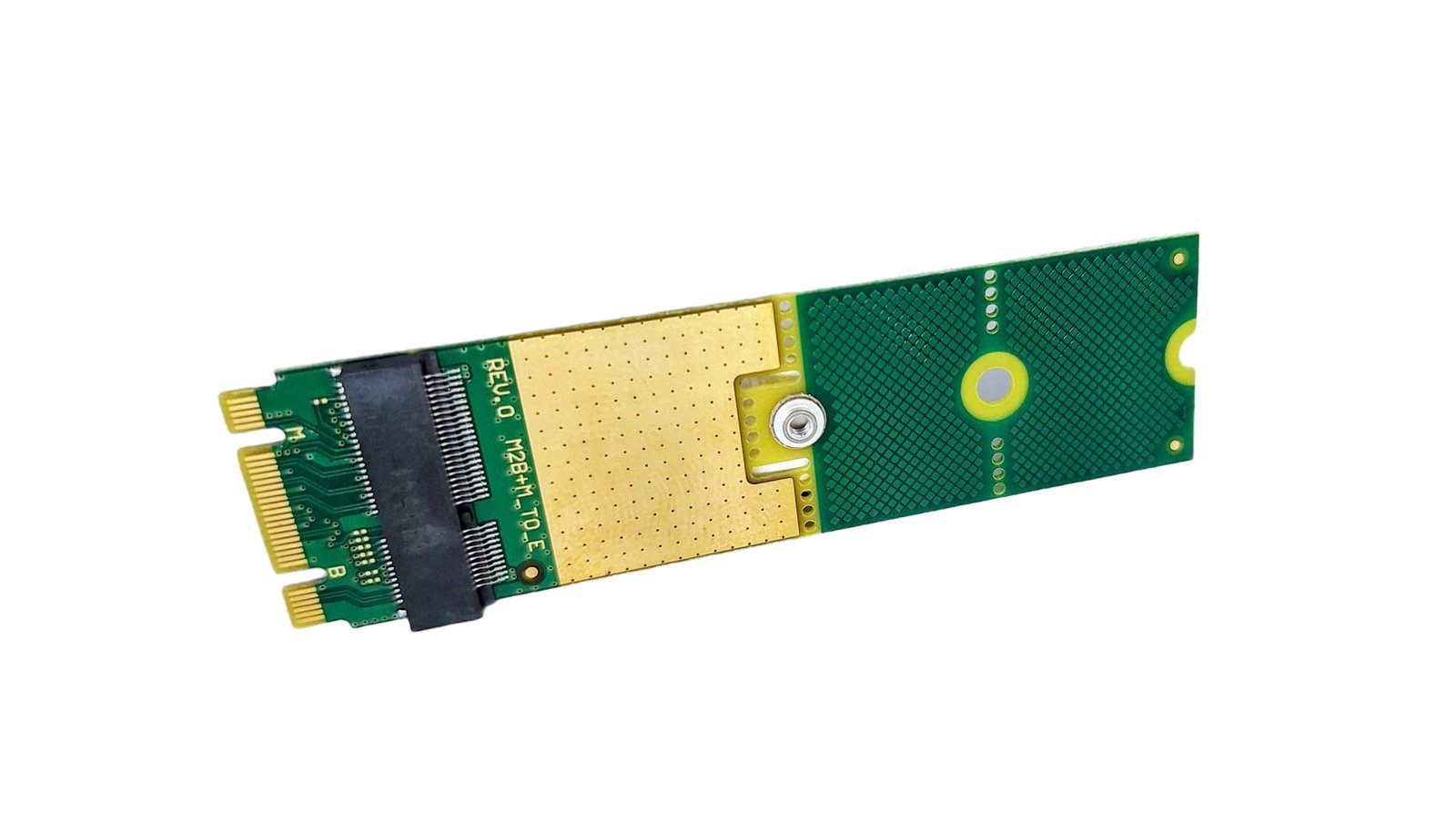 It’s hard to find this particular adapter, so we made our own. It’s 22-mm wide and has 80/60/42 screw position to support the M.2 2280, 2260, and 2242 form factors. It contains no active components, so you can just trim off whatever portion of the adapter you don’t need.