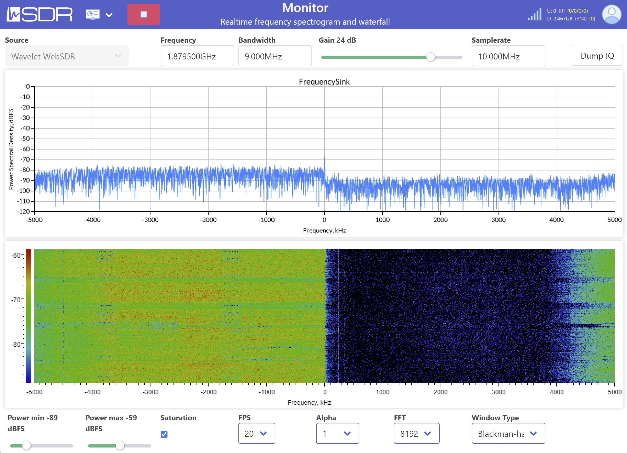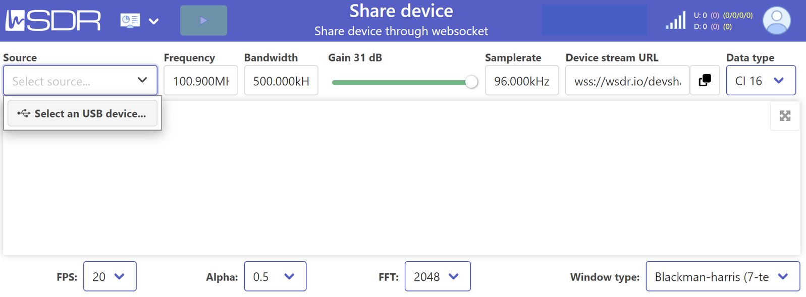 WSDR applications can receive data directly from uSDR hardware or from a remote source. Remote streams currently work over WebSockets, and we’re planning to accommodate WebTransport in the future (the primary advantage of WebTransport being support for UDP communication).