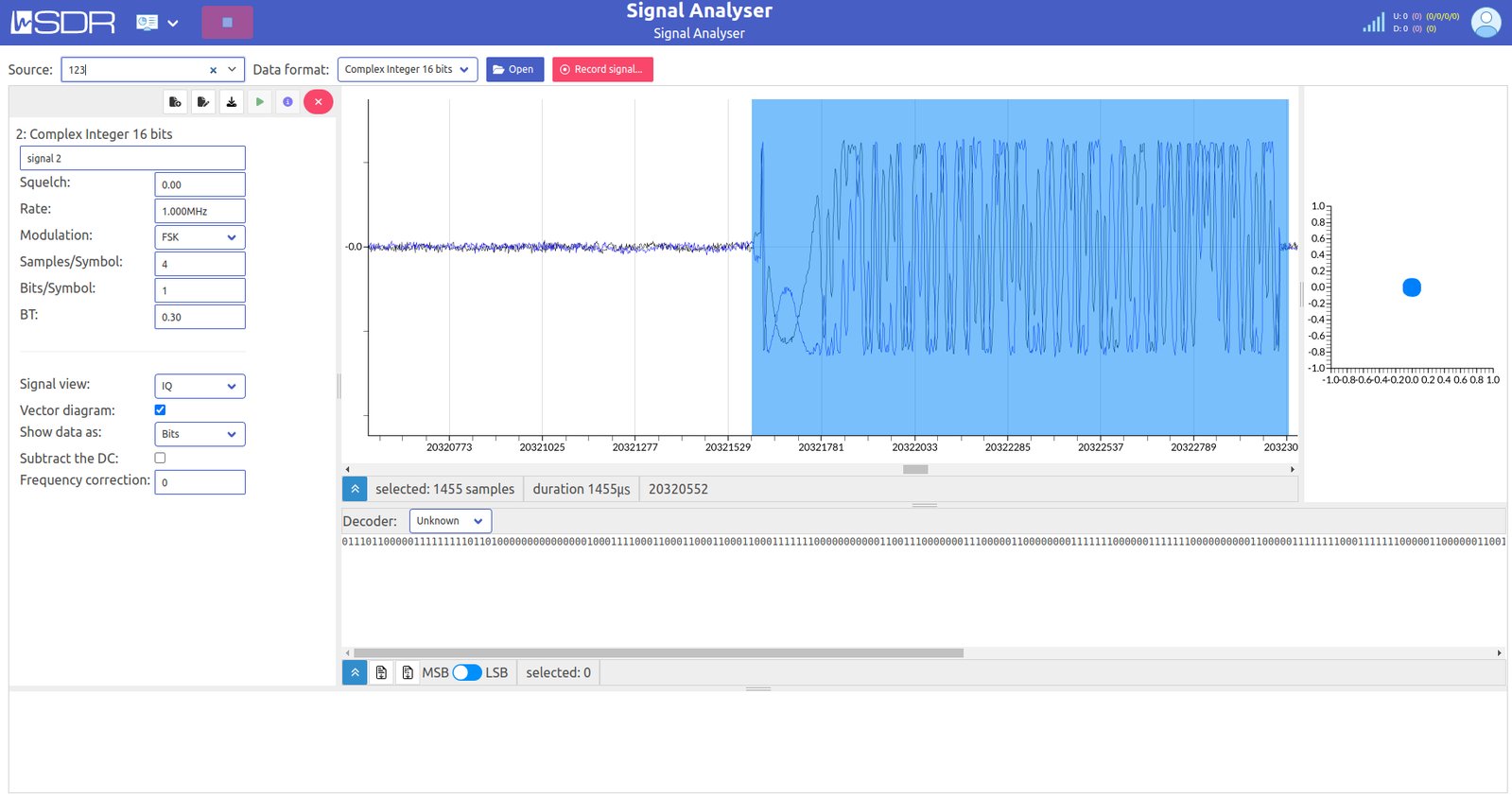 You can receive IQ data from a uSDR or from a remote stream, then you can record it or analyze it. The parsed data can be downloaded in hex or binary.