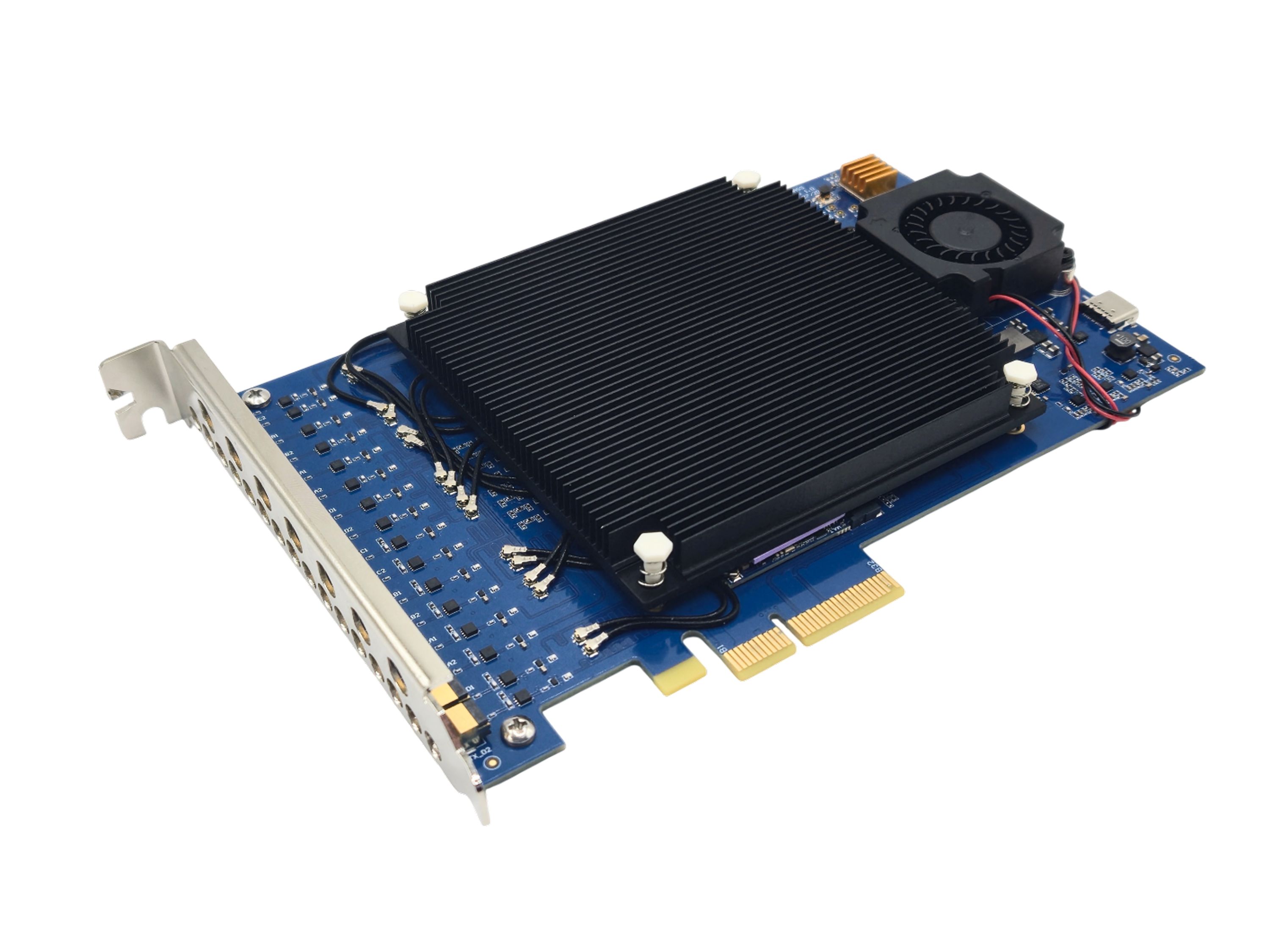 High-performance, 8x8 MIMO, PCIe software-defined radio (SDR) board. Comes with a metal PCIe bracket, a heatsink, and 16 HF4-to-SMA-F cables (1.13 mm thick and 15 cm long)